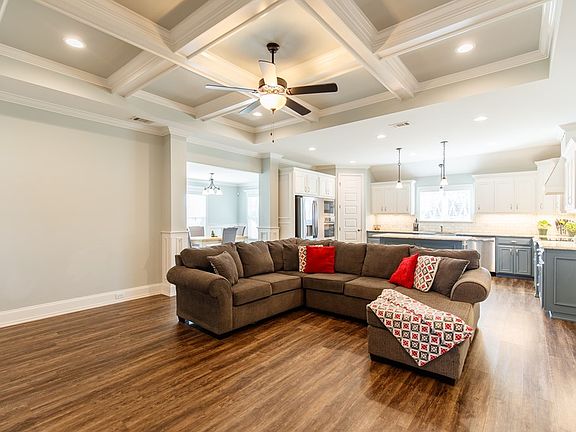 Move in ready home in Patriots Point! Located only 8 minutes from Moody AFB with a 3 car garage! Situated on 0.71 acres, this 4 bed/ 2 bath is home is a SHOW STOPPER! Inside you will find a large great room with a shiplap accent wall, recessed lighting, coffered ceilings & beautiful LVP flooring! Open floor plan is perfect for entertaining! Kitchen features custom cabinets, granite counters, farmhouse sink, SS appliances, pantry, pot filler, tiled backsplash & island! Airy master suite also features intricate ceilings, LVP flooring, barn door, large soaking tub and tiled shower. Laundry room is located steps away from the master w/ cabinet storage & sink. Step outside onto the covered patio that extends out to the fully fenced backyard. Backyard features an above ground pool w/ stone walk way, 2 storage sheds, & a pergola to provide shade from the the hot South Georgia sun!
