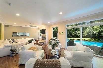 Minimalist style and sleek design is offered in this 4000 square foot, 4 bedroom, 4 1/2 bath Post Modern. This home is only one street off the bay and beach. Entertainer's delight with twenty foot ceiling and a grand piano. Formal dining room has hand made 14 foot custom made dining table. Gourmet kitchen has all the bells for the celebrity chef. Master bedroom has vaulted ceilings, fireplace and grand master bath.All four bedrooms are en suite with beautiful baths. High end teak outdoor tables, chaises and sofa highlight outdoor dining and entertaining around the 18x36 heated pool. Price is weekly with a 2 weeks minimum increments from MD-LD