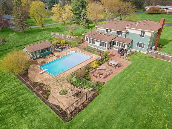 Expansive Lansing home, beautifully sited on 1.5 acres w/ gorgeous landscaping, an in-ground pool, custom fencing, pool house w/ hot tub & hardscaped patios. Extensive architecturally designed updates & additions in 2005 & 2017 create a home that includes an open floor plan along w/ intimate spaces, custom built-ins & a primary suite w/ private laundry dressing room, spa like bath & sitting area w/ fireplace. Everything will have a place in this custom cherry eat-in kitchen featuring McKenzie-Childs tile backsplash, two sinks, two dishwashers, walls of floor to ceiling cabinets & beautiful views across the great room out to the backyard & pool oasis. Private office w/ built in desks & cabinets w/ walls of windows. 3 more bedrooms, 1 an en-suite w/ private bath. Lower level includes gym & hobby space, another laundry area, workshop & storage. Tiled plant room entry from pool area w/ adjoining full bath. 2 large storage rooms off garage.Check out the VIRTUAL TOUR.Offers reviewed 5/21/21.