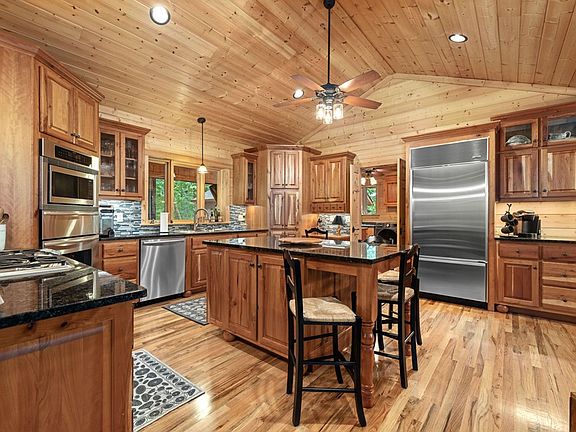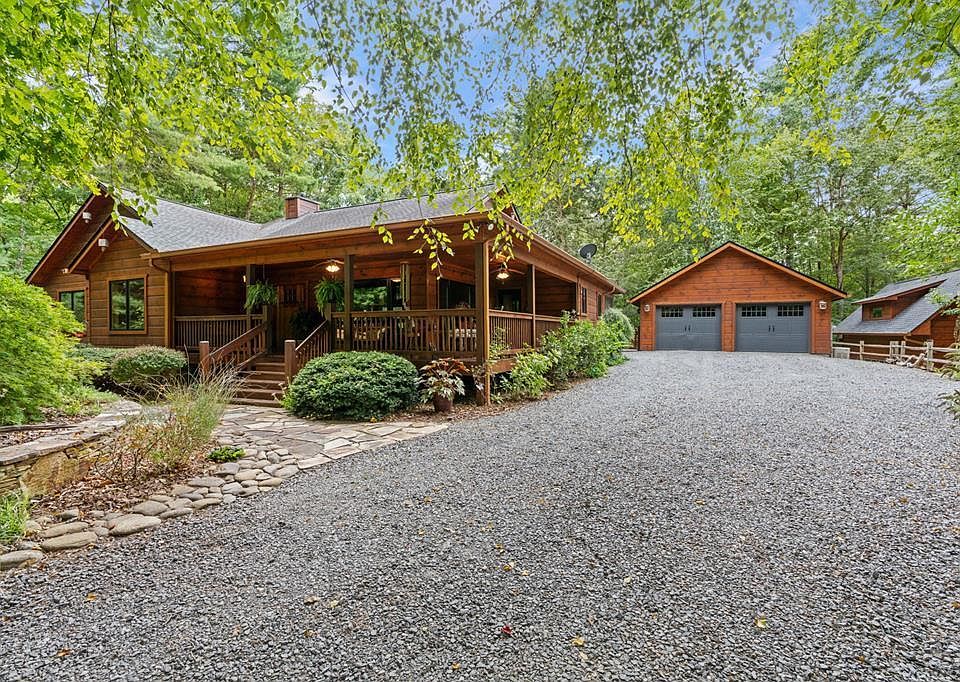 Welcome to 10 Bear Hollow Way, a secluded mountain retreat situated on over 12 acres of pristine forested land in the sought-after Goose Island Hideaway community. This rare property offers the ultimate in privacy and natural beauty with river and creek frontage, a stunning waterfall, and scenic trails that wind through the property. Follow the established trails down to the waterfall, or cast a line in the river and catch a trout or two. Watch sunsets over the mountains while relaxing on the expansive front porch, or view wildlife in the backyard from the comfort of the screened-in back porch that overlooks the forested landscape filled with Mountain Laurel blooming in the Spring. This thoughtfully designed home offers single-level living with remodeled bathrooms and a spacious kitchen equipped with top-tier appliances, including a Thermador gas cooktop, Thermador oven, warming drawer, microwave, and a Sub Zero refrigerator. The home also features a dual fuel HVAC system to keep you comfortable year-round, a tankless water heater and whole house generator that includes the garage and workshop. The spa-like master bathroom includes a custom zero-entry tile shower, dual vanities, and an 11x12 walk-in closet. Two additional bedrooms, a full bath, and a half bath provide ample space for family or guests. The great room is a warm gathering space with vaulted ceilings and a gas log fireplace. Outside, a 16x32 workshop, with finished space loft above offers endless possibilities, a game room, man cave or even a she shed, while the oversized two-car garage provides plenty of room for vehicles with attic storage. In the landscaped front yard, a beautiful waterfall and pond feature enhance the tranquil mountain setting. With this property consisting of two lots, it offers the opportunity for a second build, adding even more value to this extraordinary retreat. Whether you're seeking a peaceful getaway or a year-round residence, 10 Bear Hollow Way is a one-of-a-kind property