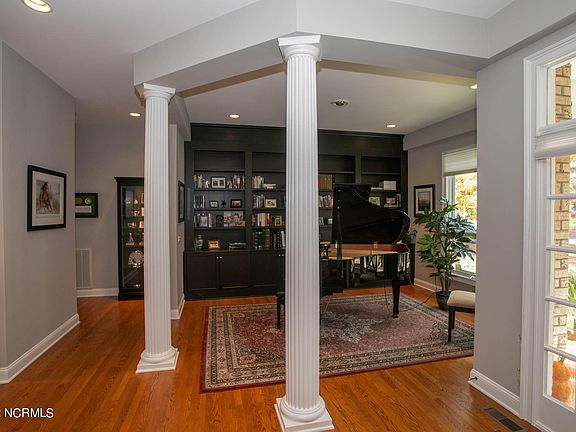 Gorgeous brick waterfront home in Fairwoods on 7 offers a fabulous light, open design with great water and golf views from nearly every room in the house! It has gleaming hardwood floors through the main living areas on both levels. Step through the front door to white wood columns setting off the dining room to one side and a library/den with a wall of wood stain cabinets and bookcases on the other and a spacious living room with a deep tray ceiling, elegant gas log fireplace with floor to ceiling wood display shelves and double glass doors with sidelights that open to back deck with automatic awning where you can relax and take in the impressive water and golf views that include the No. 7 Clubhouse, 9th, 1st and 18th holes. The living room opens to a bright breakfast nook by a bay wall of windows, gourmet kitchen with granite countertops, island with raised breakfast bar and stainless steel appliances, and a family room. A secluded main level owners' suite has a sitting area by a bay wall of windows, glass door opening to the deck, large walk-in closet with built-ins, ensuite bath with double vanities, large garden whirlpool tub and spacious step-in shower. The lower level has a spacious family/rec room with double glass doors open to a covered porch, wet bar area, two bedroom suites with full baths, one with a built-in wall safe, an office that could be a fourth bedroom with a wall of cabinets and bookcases, a huge walk-in unfinished storage area and workshop, a large golf cart storage area with room for two carts and double glass door entry from the back. The HVAC system was replaced in 2020. The home is on a beautifully landscaped corner lot and just a short cart ride to the main club house and historical Village. There is also a no wait transferable 7/9 Pinehurst CC membership.