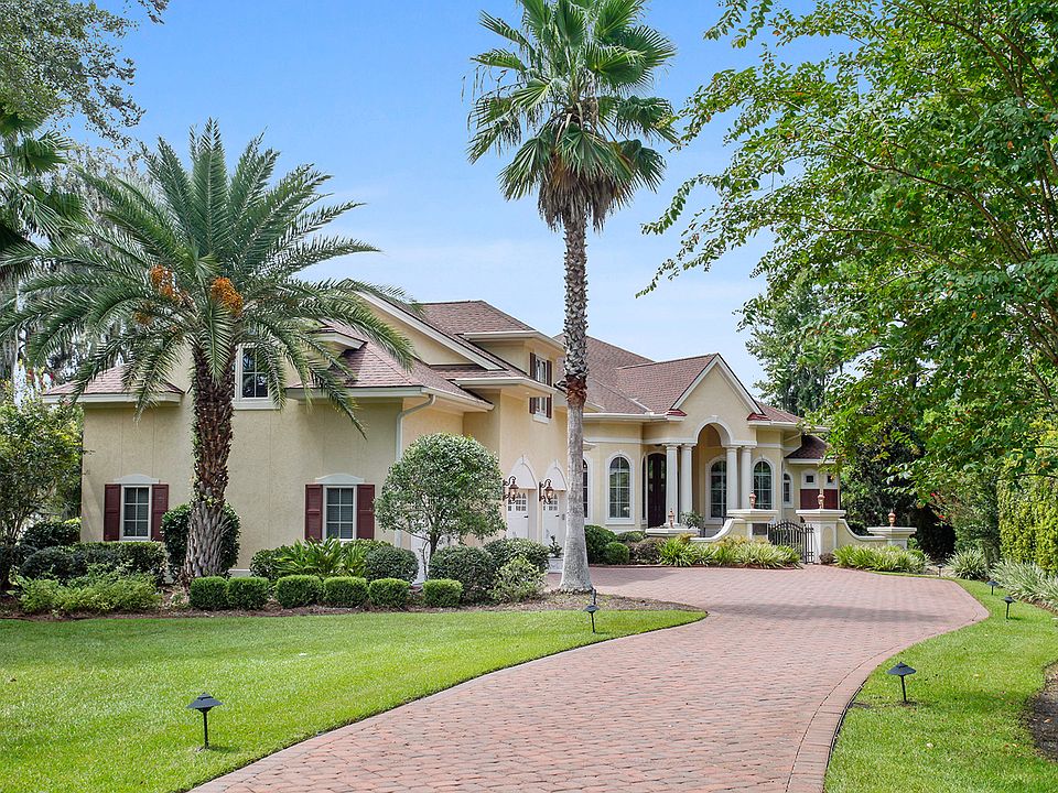 This Lighthouse Award winning custom built home by H2 Builders exudes elegance. Awe-inspiring details surround you from the entrance through the gorgeous Mahogany doors. This home provides the high end finishes demanded by a discerning buyer. Stunning custom mill work, Brazilian cherry hardwood, and Travertine throughout set the tone for luxury living. Desirable floor plan includes Master suite & 2 BRs plus office on main level and large guest suite over the 3 car finished garage. The screened lanai with fountain offers the finest sunset/lake views in Hampton Hall. On a secluded estate size lot w/ private drive, this home is outstanding.