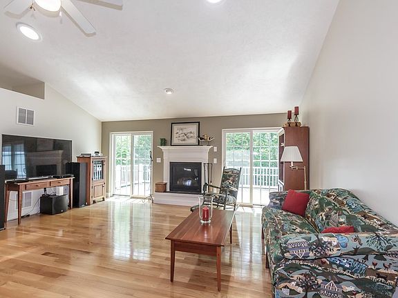 RARE FIND…55+ OUTSTANDING East Hampstead Community with its own BEACH on Angle Pond. Enjoy swimming, kayaking, picnic pavilion, etc. etc. or get out on the walking trails and sit at the gazebo by the private pond. Gorgeous 2 story townhouse, with vaulted ceiling and lots of windows. Bright kitchen with a seated bar has space for a dining table and opens conveniently to the splendid living room overlooking the private deck. This is a Wow! space with hardwood floors, a gas fireplace and includes a place for your showpiece hutch and a table if desired. There are 2 sets of sliders from the living room to the 12x22 foot deck. Sun or shade you choose with the current patio set with an umbrella. As you pass through to the bedroom area, you'll appreciate the good use of space; there are 2 sets of bookcases. The sunlit bedrooms have plenty of room for furniture. The master has his and her closets and a master bath with a double vanity. There is a separate laundry room. The basement has an unfinished ceiling and floor, but does have heat and central AC, is plumbed for a future bath and features sliders to the backyard and many windows. It's quite spacious; think of the possibilities. Angle Pond Woods allows a pet, has a large, separate lot to store RVs, etc, and has 2 bodies of water for residents to enjoy. BEST OF ALL, CONDO FEE IS ONLY $320 per month. Start enjoying the summer! Square footage is taken from the tax card; check for accuracy. See tax card.