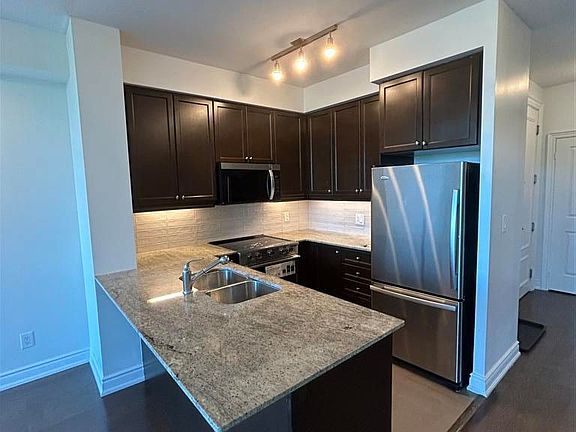 Experience condo life that feels like hotel living. This upgraded suite features 9ft ceilings, a desirable and functional layout, and the privacy you've been looking for. The spacious den can easily serve as a second bedroom, and the brand new stove adds a modern touch to the kitchen. Enjoy the convenience of included parking plus unbeatable proximity just steps to the bus stop, subway, GO Station, ravine trails, parks, and the hospital.
