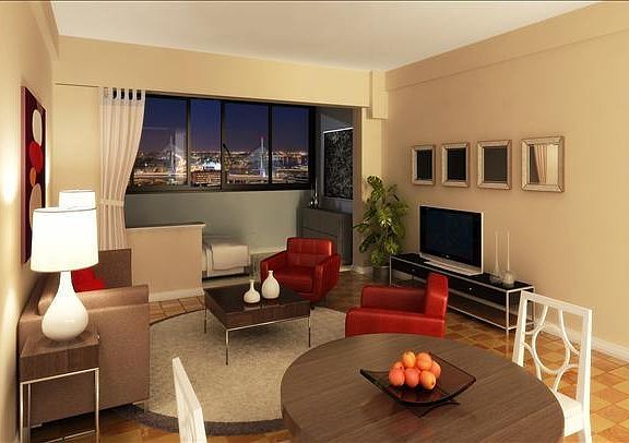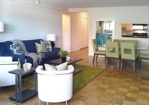 Studio apartment with ample closet space throughout including a dressing room attached to the bathroom with extra closets. Kitchen features gas stove, modern maple cabinets, and gray countertops. Additional alcove space off of living room perfect for a full or queen size bed.