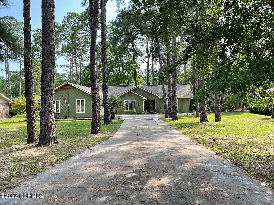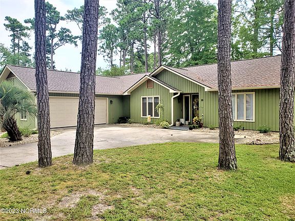 Updated, move-in ready, home in Carolina Shores subdivision. Situated on a tranquil, wooded lot, this cedar-sided home is located on a quiet street in a most desirable community covered with trees and great for walking and bike riding. Walk through the front door to a tile foyer leading into a living room with 10ft vaulted ceiling and French doors on each side of the fireplace opening out to a backyard deck. Attached to Living room is an all-purpose room that could be used for dining, an office, or whatever you wish. New laminate flooring has been installed throughout the living room and bedrooms. Brick fireplace in the living room for those cozy nights. Kitchen has been updated with granite countertops, newer stainless-steel appliances, and has a dining area with a bay window overlooking the wooded backyard. Laundry room is conveniently located near kitchen and master bedroom and has a doorway to the garage. Spacious master bedroom with large walk-in closet has a recently renovated attached bathroom with standup shower and soaker tub. Hall bathroom has been partially renovated. Second and third bedrooms could hold queen/king beds. All bedrooms and living room have overhead fans. Roof/gutters have been recently replaced. Heating/air conditioning heat pump has been completely updated recently with an 18 SEER, high efficiency system. Two car, side-loaded garage has a built-in work bench and storage. Pull-down staircase to a spacious attic. 8x12 garden shed in the backyard. Carolina Shores subdivision offers a large outdoor pool, tennis & pickle ball courts, a covered pavilion, a clubhouse with many activities, and has the lowest cost HOA in the area. Close to great restaurants, shopping, golf courses, and the Intercoastal Waterway. Ocean Isle Beach and Sunset Beach are within a few miles. Quaint fishing village of Calabash, famous for its seafood restaurants & shops, is adjacent to Carolina Shores. Wilmington and Myrtle Beach are conveniently close.