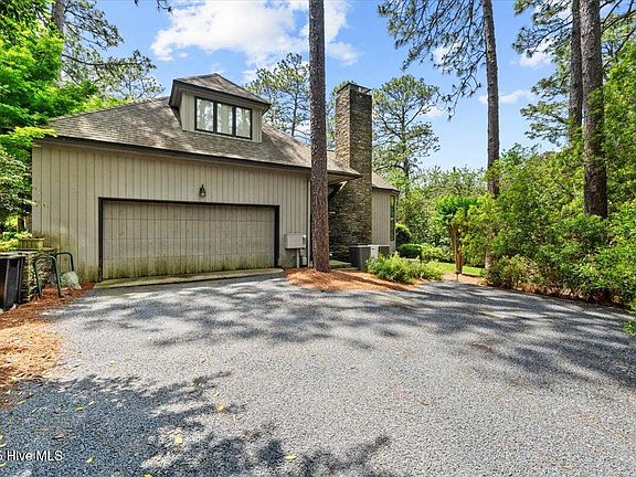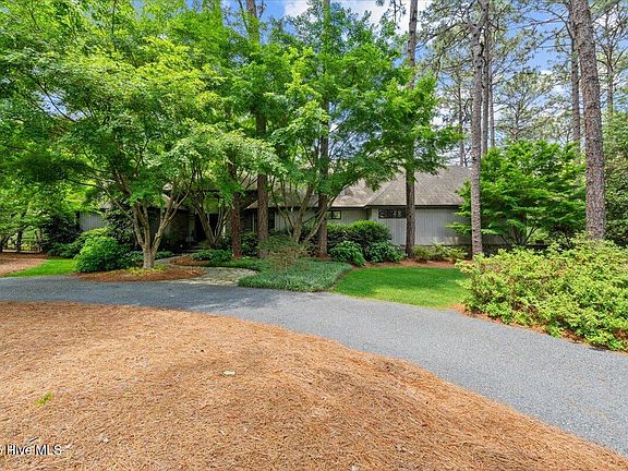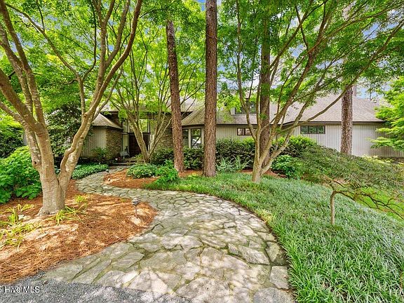 Tucked inside the gates of Pinehurst's prestigious Country Club of North Carolina, 10 Brookline Drive is a timeless estate crafted by renowned builder José Camina. Thoughtful design and masterful craftsmanship are on display throughout, with hand-chiseled stone details woven into both the exterior and interior—stone-clad retaining walls, a stunning spiral staircase wrapped in stone leading to a private wine cellar, and multiple fireplaces that anchor the home in warmth and character. The double-sided fireplace between the living and dining rooms, plus additional fireplaces in the living room and primary suite, create inviting spaces throughout. The home is clad in wood siding with rich stone accents, nestled beneath a canopy of mature, gorgeous trees. Soaring windows in the living room frame peaceful pond views, while the flowing floor plan adds a sense of ease and elegance.