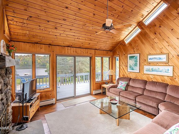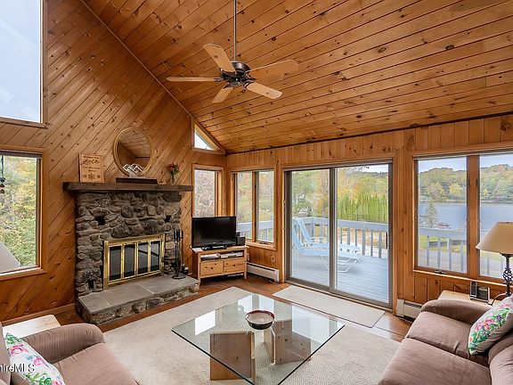 - Description: Wood-burning fireplace and glass doors to deck.