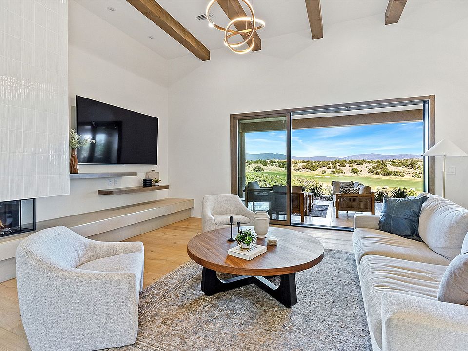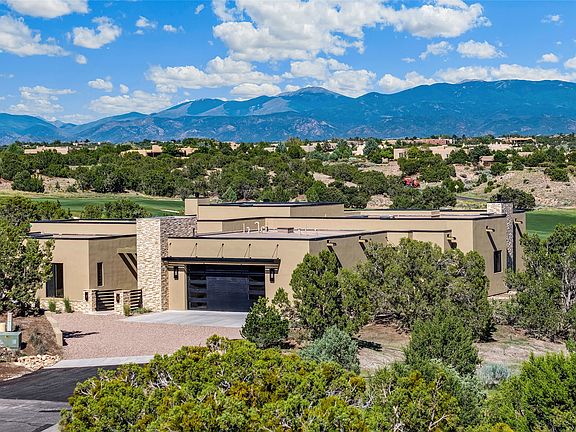 Welcome to 10 Calle Arbusto, an exceptional 2025-built custom contemporary masterpiece by the renowned builder, Clay Custom Homes. Recently completed and featured in the 2025 Haciendas Parade of Homes, this tranquil retreat is perched high above it all, offering breathtaking views of the 17th fairway at Sunset Golf Course and stunning Sangre de Cristo Mountain views. This rare offering showcases striking architecture paired with high-end designer finishes. Located within the famed community of Las Campanas, within close proximity to The Club at Las Campanas, (2) Jack Nicklaus golf courses, Spa, Swim, Tennis & Fitness Center, this home is designed to provide the ultimate indoor-outdoor living experience, ideal as a primary residence or a luxurious secondary retreat. The single-level, open-concept layout features a spacious living room with a wet bar and wine cooler, gas fireplace, sliding glass doors and a spacious dining area that seamlessly extends to outdoor living spaces, including a covered portal with an outdoor fireplace. The state-of-the-art island kitchen boasts expansive mountain and golf course views, rich cabinetry, tambour wood accents, a walk-in pantry, and top-of-the-line Dacor appliances and (2) dishwashers. The generously sized owner’s suite delights with views, portal access and a spa-inspired bathroom with a glass walk-in shower, soaking tub, and a large walk-in closet. The separate guest wing includes two ensuite bedrooms and a versatile living room, perfect for accommodating guests, or a media room. Additional features include a private dedicated office, built-in BBQ/grilling station and outdoor kitchen, wood flooring, exotic stone countertops, abundant natural light, rich beam accents in the living room, and an oversized 2 car garage. This home exemplifies the pride and craftsmanship that embody the true Santa Fe lifestyle. Membership to The Club at Las Campanas is optional and by invitation only, though required to access all Club amenities.