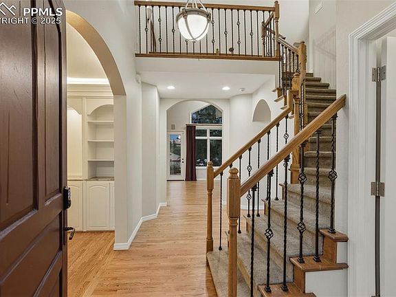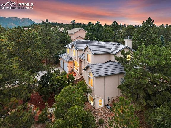 Welcome to a stunning luxury retreat in the exclusive Woodmen Oaks neighborhood. This 5-bedroom, 5-bath, 4,790 sq. ft. custom home rests on a private ¾-acre wooded corner lot and combines timeless elegance with modern updates. From the moment you arrive, you’ll appreciate the professionally landscaped grounds, rare natural hoodoo rock formations and the serene setting that makes this property one of a kind. Inside, soaring ceilings and expansive windows set the tone for gracious living. The gourmet kitchen boasts granite countertops, updated stainless appliances, a large granite sideboard, and opens seamlessly to the great room with its dramatic beamed ceilings and stone fireplace. Both spaces flow onto a spacious deck, complimented by a tranquil water feature; ideal for indoor-outdoor entertaining. A formal dining room with French doors, new hardwood floors, and deck access adds to the home’s sophistication. The main level offers true single-level living with a luxurious primary suite featuring two walk-in closets and a spa-like 5-piece bath. A sunken sitting room, powder bath, and main-level laundry complete this floor. Upstairs, you’ll find a private guest suite with ensuite, two additional bedrooms with private lavatories & a Jack & Jill bath. A versatile office with built-ins features sweeping views. The fully finished lower level is designed for entertaining with an expansive family/game room, tile flooring, wet bar, fireplace, dining space, and direct walkout access to the backyard oasis complete with fenced yard, artificial turf for year-round greenery, and a new hot tub. A fifth bedroom and full bath with a walk-in shower complete the lower level. Additional highlights include fresh interior paint, newly sanded and stained hardwood floors on the main level, and an oversized 3-car garage with workbench. Blending privacy, beauty, and exceptional craftsmanship, this home is ready to welcome you home just in time for the holidays.