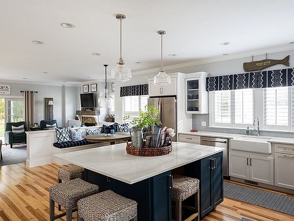 Welcome to Coastal Elegance at Scorton Shores. This custom home built in 2018, a short distance to private deeded beach and Professionally Decorated. Boasting approximately 2750 sq ft of Prime Living Space. Beautifully appointed home, Chef's kitchen: Fully equipped top-of-the-line SS appliances and stunning quartz counter-tops. The center island offers seating for 6, complemented by beautiful built-in banquette dining area. The open Fl plan seamlessly connects the kitchen to the LR, where a gas FP and custom built-ins create an inviting atmosphere. Luxurious Sleeping Quarters, including 2 Master King Suites, 1 conveniently located on the 1st Fl. and another on the 2nd, both en suite. A 2nd fl BR opens onto a private deck overlooking the fenced in backyard. For added versatility, a custom bunk room awaits featuring 4 Queen Size beds. The covered porch provides an outdoor kitchen, gas grill, ice maker and sink. Professionally landscaped, outdoor shower, and multiple zone irrigation