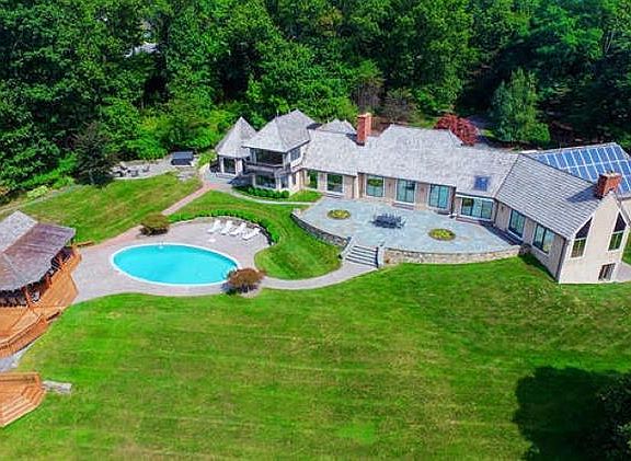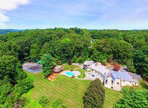 Spectacular views from every room of this captivating French Normandy design custom home- replete w earth-tone hard coat stucco exterior and cedar shake roof-boasts nearly 5, 200 sq ft of commodious living space on two sprawling floors with a multitude of rear exits to the expansive bluestone patio, sparkling in-ground swimming pool and full sized pool house, hot tub, fire pit, rear yard, and tennis court, plus an exceptional finished lower level with walkouts-a truly unique and architecturally dynamic home that blends striking design, dramatic proportion, and natural elements in the most compelling of ways.13 rooms, 4 bedrooms, 4.2 baths, and option of one level living w first floor master suite w every amenity on same floor. Breathtaking 180 degree panoramic views and evening sunsets are spectacular
