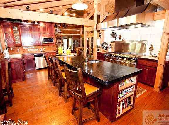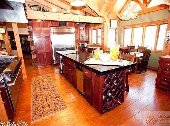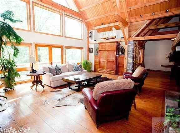 Spectacular Home with a Spectacular View!! This post and beam construction, large pine log has two spacious living areas, an open kitchen with plenty of cabinets and countertop space. Split floor plan with two bedrooms up with walk-in closets and three beds down. Large office downstairs. Outdoor entertaining areas on both floors overlooking the beautiful creek and trees. 3 Car Garage. 1800 sq. ft. guest quarters with 3 beds, 2 baths, laundry room and 900 sq. ft. workshop. You'll appreciate the views!!