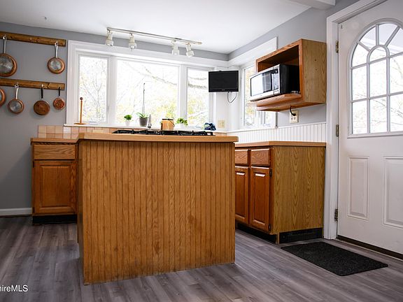 Charming New England Farmhouse with mahogany front porch situated above the quaint village of Lenox Dale and abutting bucolic Golden Hill Road, Montessori School of the Berkshires and Miraval Berkshires Resort and Spa. Open living concept with bright eat-in kitchen/dining room with views of October Mountain, new kitchen & laundry room floors. Sliders leading to patio and side yard. Spacious living room with hardwood floors. Second floor offers 4 bedrooms with space for additional bathroom. Natural gas heat with newer Burnham boiler. 200 Amp electric. Oversized detached 2 car garage built approximately in 2010 with shop set up in lower level, propane heat & electric. Second floor has permitted separate accessory dwelling /in-law quarters. (extra living space) The garage and in-law apartment are not included in the square footage.