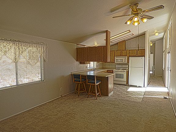 Lots of special features in this great home perfect for singles, couples and small families. The living area is open and spacious with high vaulted ceilings that lend to the spacious feel. The kitchen has plenty of counter space and cabinetry with a breakfast bar. The master has a sliding door onto the large deck that overlooks the valley and mountains. There’s a laundry nook that includes the washer and dryer. Step out onto the huge deck great for entertaining and enjoying the views. 2 car garage, central AC and more! Lot Rent: 681/mo | Includes: None