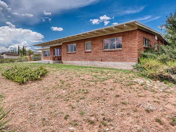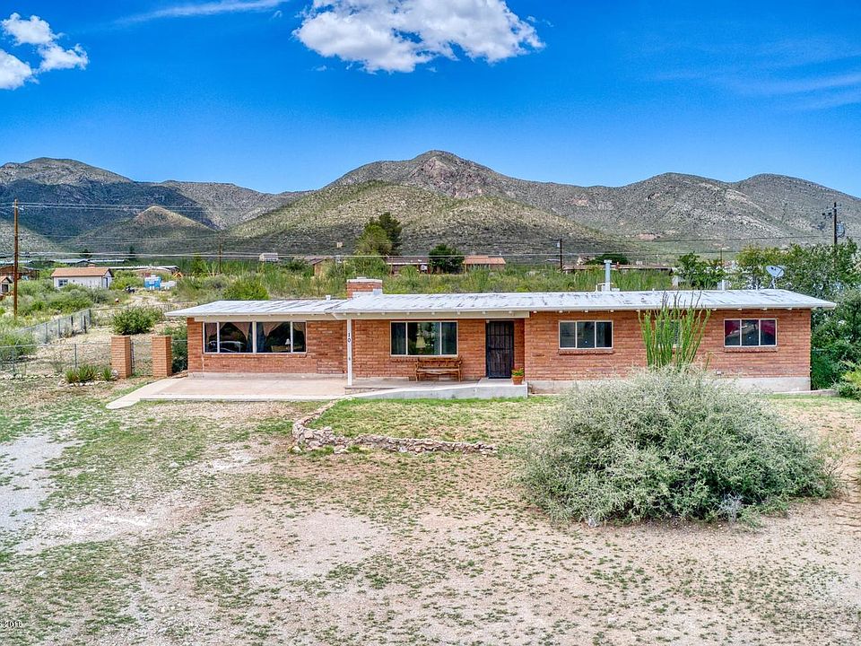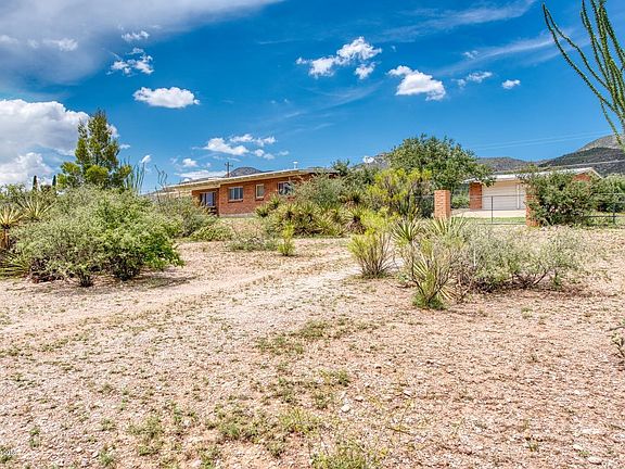 Solidly built burnt adobe block home with panoramic views and covered patio to enjoy them any time of the year. Large family room wired for sound, formal dining room, one bath with shower, second bath with garden tub, two bedrooms and an office/den room that could easily become a third bedroom/guest room. Tile throughout, with carpet in the family room.Detached two car garage and chain link fencing along the entire acreage. Appliances to remain, including the stackable washer/dryer. Two a/c units allow you to cool part or all of the home and is heated by a forced air gas furnace. Roof is built-up w/coating. Vaulted ceilings with exposed beams and French doors in the dining room, and an alarm system are added touches. Home inspection available.