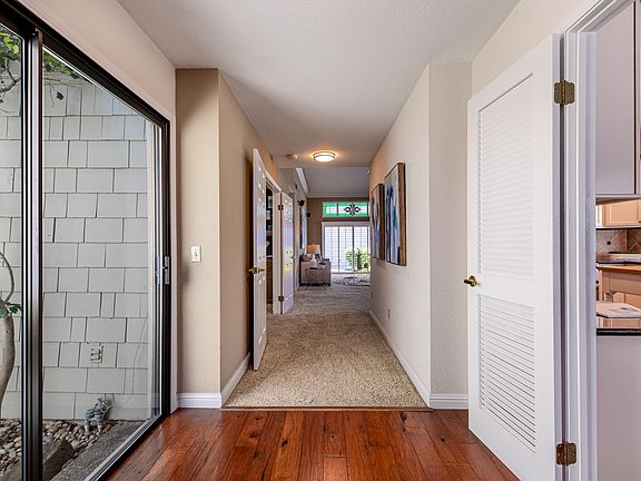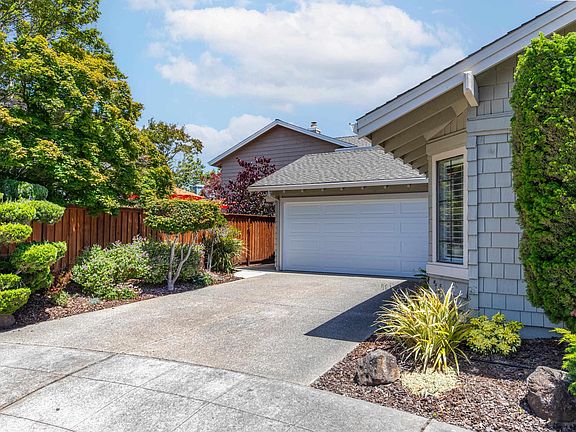 Welcome to 10 Coleport Landing, a charming single-level residence in the sought-after Harbor Bay neighborhood of Alameda. Nestled at the end of a tranquil cul-de-sac, this home blends modern comfort all on a single level. Step through the double front doors to a serene garden atrium, creating a bright and airy ambiance. The remodeled kitchen features custom cabinetry, stone countertops, a built-in desk, and a breakfast area. The spacious living room boasts a wood-burning fireplace and access to the side yard via French doors and the backyard through a sliding glass door. The primary suite is a retreat with generous closet space, an en-suite bathroom with dual sinks, and backyard access. The second bedroom opens to the atrium, and the third, currently an office, can easily be converted back to a bedroom. The private backyard oasis includes a putting green, well-manicured garden, and patio area, ideal for relaxation and recreation. This home includes a dedicated laundry room, ample storage, plantation shutters and an attached two-car garage with interior access. Conveniently located close to major transportation routes and award-winning schools and walking paths.