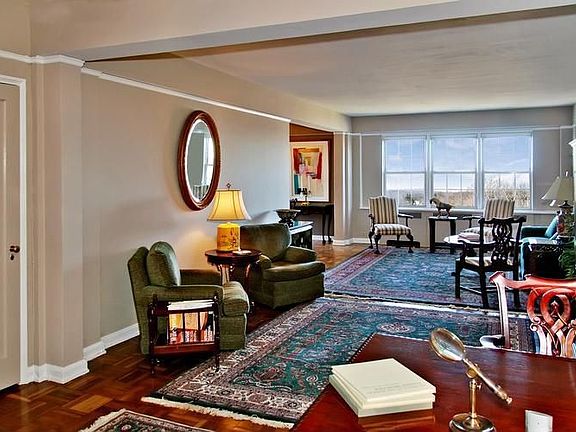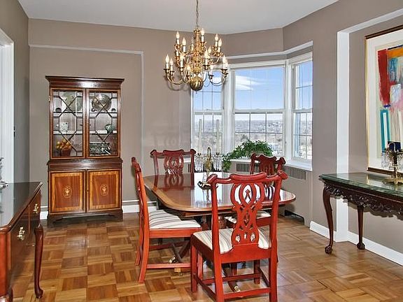 Pristine End Unit in the south tower just below the Penthouse with extremely rare separate wing for Master Bedroom. Renovated kitchen and baths. Laundry Room in unit. Redone parquet and herringbone floors. Majestic view to the south, west and north. This unit is special. The layout is superb and hard to find with its separate wing configuration and huge living room where large scale entertaining can be done. Formal Dining Room. Sleek Kitchen with new stainless steel appliances. Crisp and freshly painted. Tumbled marble master bath. Fabulous closet space. The Rockcliffe is a prestigious building with 24 hour doorman. Easy access to NYC transportation. Property Taxes Heat and Hot Water included in maintenance fees which are partially tax deductible.