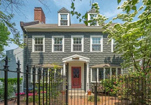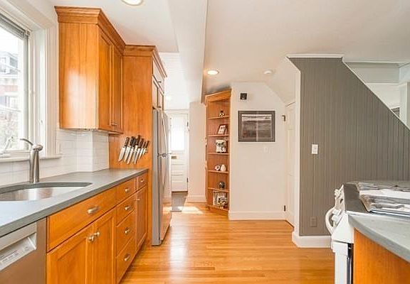 Situated near Monument Square, this beautifully maintained free-standing single family with driveway parking is a rare find! Fenced patio with a mature garden is picturesque and private for your outdoor entertaining and a welcoming entrance to family and friends. First floor offers an open concept living with two wood-burning fireplaces and windows on all sides allowing for beautiful light from every angle. The living room is inviting and comfortably spacious, while the kitchen is open and has island seating and looks onto the dining room; there is also a half bath on this level. Second floor offers a master bedroom with fireplace and mantel, a second bedroom and a spacious full bath. Third floor is another 2 bedrooms with gorgeous wide-pine floors and skylights. Additional features include: easily accessible interior access basement storage, new all-wood windows throughout, high-effiency gas boiler and expansion potential.