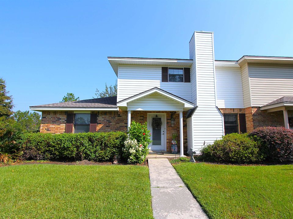 Spacious end unit condo in Lumberton, conveniently located between Highway 96 and Village Creek Parkway. Welcoming living room features woodburning brick fireplace and built-in bookshelves. Kitchen includes a pantry, granite tile countertops, built-in microwave and range. Primary bedroom downstairs is oversized with room for sitting area or office. Laundry room with half bath downstairs. Upstairs there's lots of storage with multiple closets, large bedroom and full bath. flex room open to bedroom and landing could be an office space, hobby room, gym, or easily converted to a 3rd bedroom. Back patio is attached to the 2-car carport. Unit also comes with an exterior storage building. New roof installed 2025.