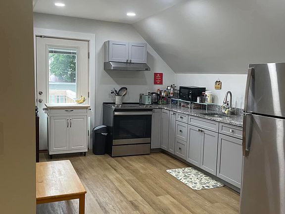 This beautifully renovated 1-bedroom, 1-bathroom apartment is located on the 3rd floor and offers a perfect blend of comfort and modern style. The custom kitchen and bathroom feature granite countertops, stainless steel appliances, and a stunning floor-to-ceiling tiled shower. The main living area boasts an open-concept design. Step outside to your private deck and enjoy some fresh air. The building includes shared laundry facilities and is equipped with 24-hour security cameras for added peace of mind. This apartment is the perfect combination of contemporary upgrades and cozy living. No smoking is permitted. Requirements include a first month's rent, a security deposit, good credit, background checks, and 1 year lease. Rent includes heat, water, sewer, plowing, yard care, and high-speed internet.