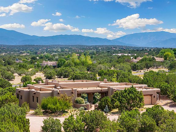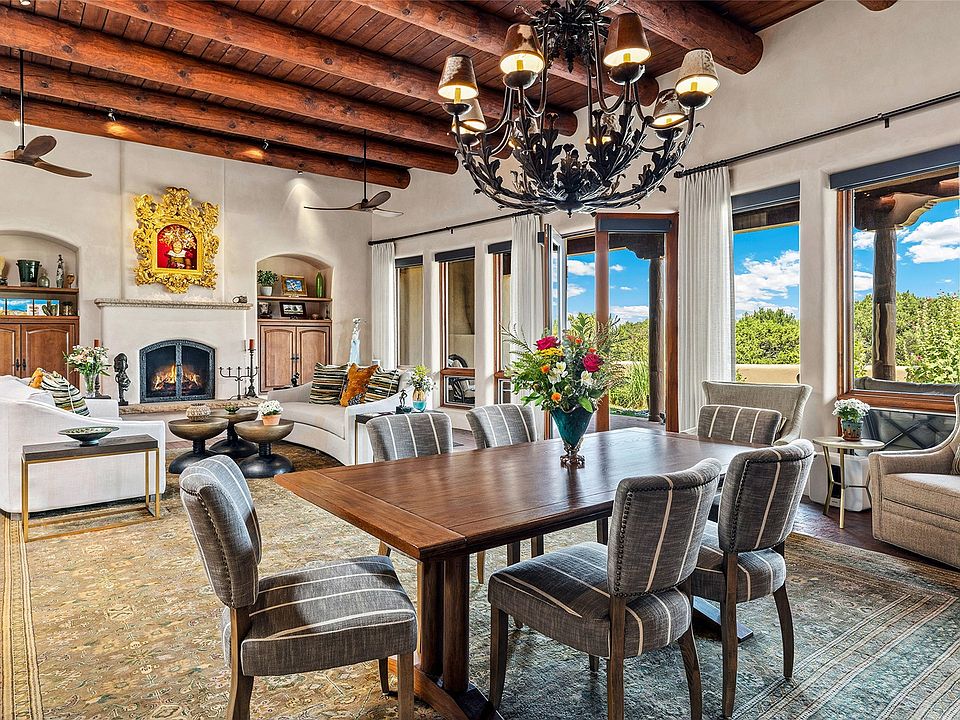 Experience the ultimate Santa Fe lifestyle in this stunning Las Campanas residence showcasing sweeping views of the Sangre de Cristo Mountains and newly updated luxury finishes throughout. Built by award-winning builder Tierra Concepts, this exceptionally designed single-level home features four bedrooms and embraces the essence of quintessential Santa Fe architecture, paired with a seamless indoor-outdoor lifestyle. Just minutes from both the historic Plaza and The Club at Las Campanas, this home welcomes you with a beautifully landscaped front courtyard adorned with vibrant landscape. The fully enclosed back portal, complete with a cozy fireplace and built-in BBQ, offers the perfect setting for year-round entertaining and a secure retreat for pets. The newly designed chef's kitchen, by the acclaimed designer David Naylor impresses with a natural stone island and breakfast bar, newly installed custom cabinetry, abundant storage and premium state-of-the-art appliances, all of which opens to a casual dining or living area, with its own fireplace and direct portal access. From there, the space flows effortlessly into the expansive great room, with a spacious formal dining area, fireplace and dramatic picture windows which frame the breathtaking Sangre de Cristo mountain views. The luxurious, private owner’s suite is a serene escape, boasting a kiva-style fireplace, mountain views and a tranquil spa-like modern bath complete with a stand-alone soaking tub, walk-in shower, dual vanities with natural stone counters and dual walk-in closets. Guests enjoy complete independence with a spacious ensuite which offers a full bath and large walk-in closet, plus two additional guest bedrooms which share a well-appointed full bath, offering privacy and flexibility. Additional updates include a newly updated roof and ductless cooling and heating system, plus an updated boiler for radiant heating. A full updated features list is available upon request. This home is not to be missed!
