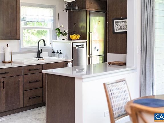 Incredible opportunity to live in one of the most coveted neighborhoods in Albemarle County while also owning a piece of history! This 1953 home was designed and built by well known architect, William Hale, a colleague of Milton Grigg, for his personal residence. The home has lovingly been updated while also preserving the history by the current owners. The hardwood floors throughout the main floor and beautiful crown molding speak to the original character of the home. Some modern upgrades include the kitchen opening to the dining room for seamless entertaining. Thoughtful kitchen renovations include new wood cabinets, quartz countertops, pantry storage, Bosch appliances, and versatile LVT flooring. The sliding glass door from the dining room allows for indoor-outdoor entertaining on the soapstone patio, while the spacious living room with wood burning fireplace offers cozy opportunities indoors. Each of the 3 bedrooms have ensuite baths, all updated within the last two years. The "unseen" fundamentals have also not been neglected with updates including new roof, HVAC, water heater, duct work, vapor barrier, and much more. Check out the improvements for a full list.