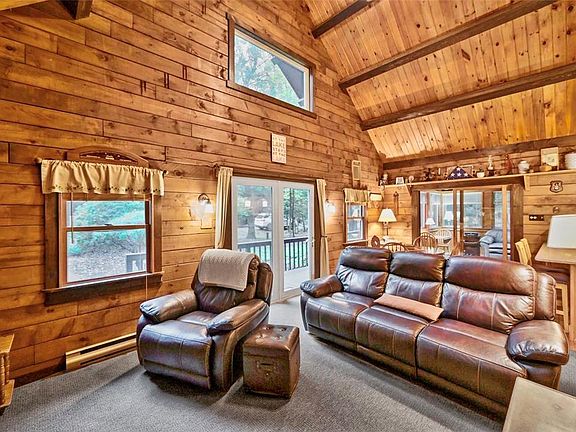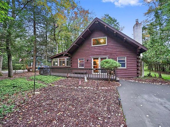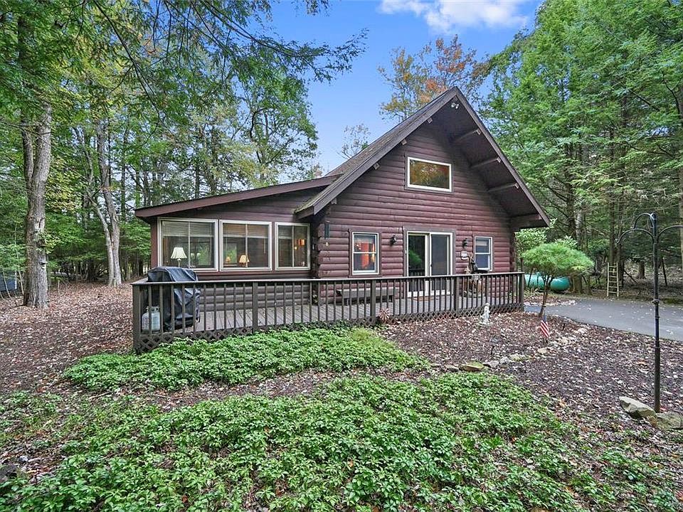 Enchanting Pocono Log Home Situated On 1+ Acre Corner Lot In Tranquil Cul-De-Sac Setting Amongst Lush Greenery! Offering 3 Bedrooms, 2 Full Bathrooms & Many Updated Features Including Ceramic Tile & Quartz Countertops. Open Concept Living Space Showcases Cathedral Ceilings, Pine Wood Flooring & Stone-Faced Propane Fireplace w/ Gorgeous Sunlit Timber Throughout. 2nd Story Master Bedroom Suite w/ Hardwood Flooring, 2 Walk-In Closets & Private Loft Seating Area. Meticulous Outdoor Space Includes Paved Driveway, Storage Shed & Relaxing Front & Private Rear Decking For The Entertainer Or Home Body! Family Style Sun Room Offers Propane Heater, Abundant Natural Light & Nature Views. Just Moments To Amenities & Large Community Lake. Welcome To This Well-Loved & Inviting Home!