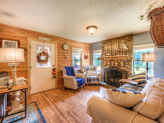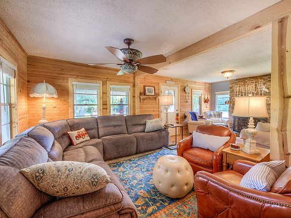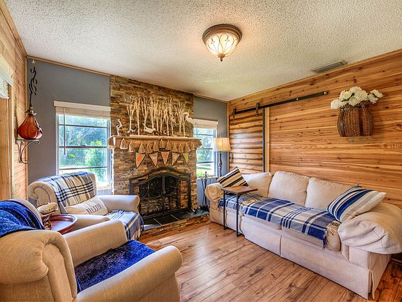 This immaculate designed home with a screened front deck and back patio invites comfort, and exudes modern style. 2 bedrooms, 1.5 bathrooms provides a generous living space and stylish finishes, you'll enjoy a perfect setting for relaxing and entertaining. Every detail was carefully selected and quality crafted. Beautiful Oak finish laminate floors throughout. Pine bead head wall paneling and plenty of natural night flow throughout the home's open, airy layout, 1155sf. Other special highlights include charming chic lighting and remote-control ceiling fans, bathtub, tons of storage space, laundry room. Enjoy gatherings in the generously sized living/dining area graced by a wood burning fireplace, with rich exposed brick. Kitchen is clad with premium finishes and fixtures including custom lacquer cabinets, solid surface counters and up-grade stainless appliancesâEUR¦ enhanced with custom wooden storage fixtures. Master suite, custom closet and shelving, rich wood coloring vanity cabinets, ceiling and wall finishes. Stand alone tub & shower. Located on 0.39 acre lot landscaped with Mature Oak trees.