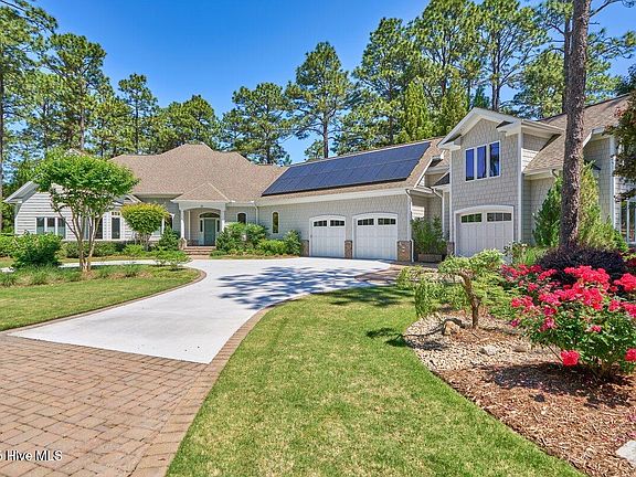 Prepare to check all the boxes with this beautiful home in Pinehurst National #9. Golf front with views of 2 fairways (tee box and fairway of #8 and green and fairway of #7 holes), this home has 4 bedrooms plus an office, 3 car garage with EV plug, solar panels that make a significant difference in power costs, open floor plan with combined living area and kitchen, formal dining area, 3 beverage refrigerators, 2 dishwashers (entertainers' dream!), primary bedroom plus 2 more on the main level with another bedroom plus studio/den upstairs (currently used as the owner's craft area), water feature outside, beautiful mature landscaping, covered patio with built in grill on lower patio, 10+ foot ceilings in main level and 9 ft. ceilings in upper level, and a Pinehurst Country Club Signature charter membership available for transfer. Enjoy the natural light streaming in from the large windows across the back of the home while watching golf or nature! The home was built by Bonville Construction and addition built by Bonville as well. So much more ----see and feel this lovely home.
