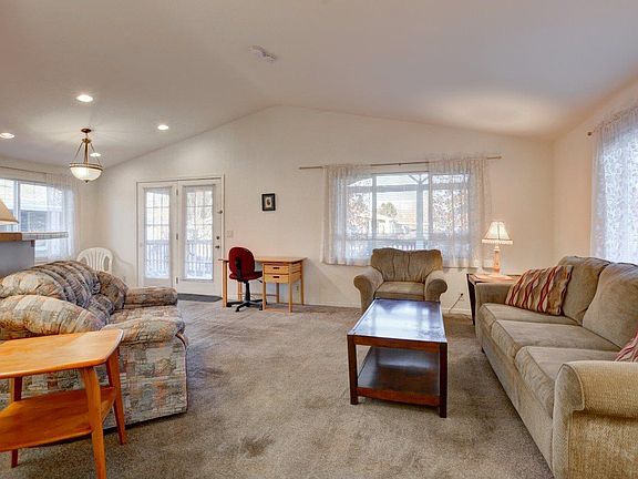 Welcome to this spacious 1350 sq. foot, 2-bedroom, 2-bath home with an office, nestled in a serene all-ages park. The open floor plan, vaulted ceilings with an abundance of natural light, creates an inviting and comfortable atmosphere. The large kitchen boasts modern stainless steel appliances, a breakfast bar, and ample storage, providing both functionality and style. The primary bedroom is spacious and offers two walk-in closets and a double sink. Additionally, a storage shed adds practicality to this already well-equipped residence. Welcome to a home that seamlessly blends modern living with energy efficiency in a vibrant and welcoming community that offers many great amenities that include a clubhouse, exercise room, swimming pool, playground, RV storage and more! Call or text the listing agent today to schedule a tour.