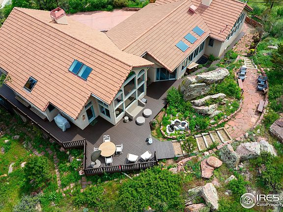This is one of the most unique and special residences in Lyons. . . perhaps in Boulder County. Perched on a large double lot at the base of Steamboat Mountain sits this gorgeous, beautifully designed custom home with timeless elegance and spaciousness. Walls of windows capture postcard views of the land, interesting rock formations and the parklike backyard with water feature and large decks. Living areas are open, spacious and blend beautiful finishes that feel both organic and stately. Large culinary kitchen provides lots of counter space, an eat-in kitchen bar, pantry and appliance package. An elevator makes accessing each level of the home including the large, oversized double (4-car) garages and basement level a breeze. The main level is truly light-filled with large windows, skylights and soaring ceilings. The space is flexible if you want multiple living areas, to create an office or dual offices. The lower level offers 3 additional guest rooms and guest baths, a mud room and additional family room. The interior floor plan offers everything: space, flexibility, storage and a level of comfort that will inspire quiet evenings at home and large gatherings alike. There is over 1,500 square feet of garage space. One of the garages has a space for your workshop. The home has numerous decks, entry patio, terraced yard and a large, private driveway that embrace the beauty of the outdoors while providing privacy and serenity. You won't want to ever leave this home. But if you do, downtown Lyons with charming restaurants, shops, parks and its celebrated music festivals are all within a short walk from this home. Estes Park is a 30-min trip up the hill. Recreation abounds with numerous hiking, biking and kayaking opportunities. This is one of the most exceptional places to live in Boulder County.
