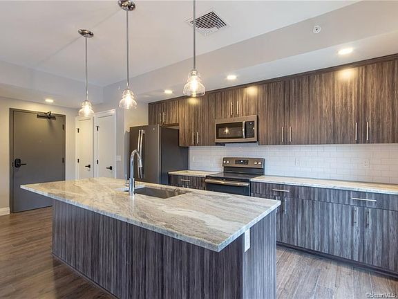 Stunning 1,200 square foot apartment with a rustic, urban feel- impeccably designed within the Edgewater Hill Community. The floor to ceiling windows in this third floor apartment will take your breath away as you enter the open concept living room, dining room, and kitchen. Sunlight bathes the entire area giving a warm and inviting feeling. A generous 10' kitchen island with gorgeous granite counter tops and three unique, hand selected pendant lights welcome you into the exquisitely designed kitchen. The upscale, slate GE appliances perfectly complement the soft close cabinetry, which has a rich, chocolate textured finish. There is a wrought iron juliette balcony off the master bedroom, along with a generous walk-in closet, which then opens into the master bath. There is also a second bedroom and full bath with tub just across the hall. For those cool, wintry nights grab your favorite beverage and snuggle up on your couch in front of a warm and cozy fireplace. Don't wait to call on this amazing apartment, complete with elevator to second and third floors. Edgewater Hill is a combination of retail and commercial spaces with beautifully designed and landscaped apartments and neighborhoods. Grilling areas, playscapes, and pocket parks will be placed throughout this 79 acre walkable community. One pet under 50lbs welcome- $35/mo-Come visit and see why #lifejustgotbetter