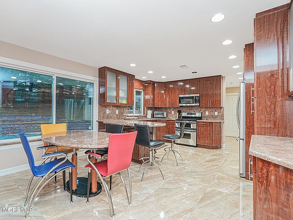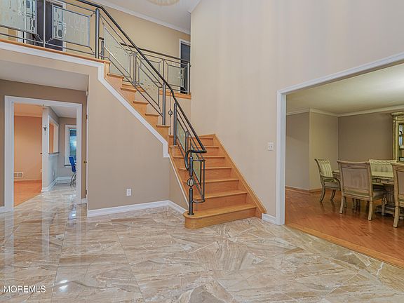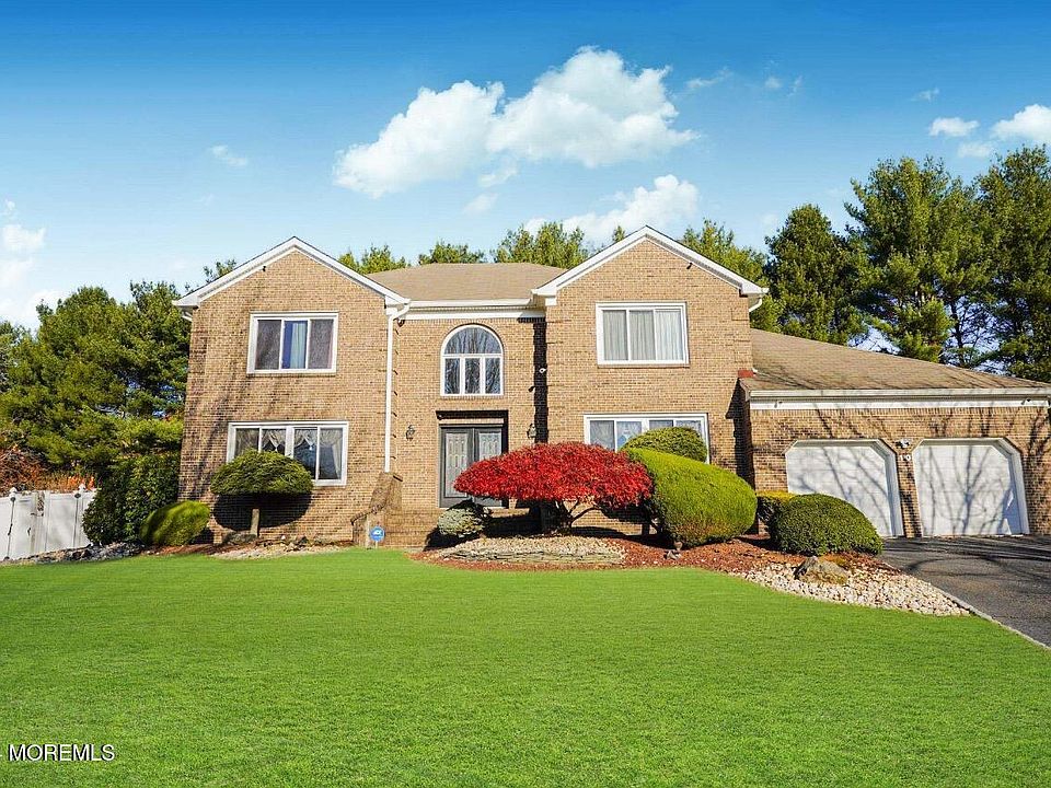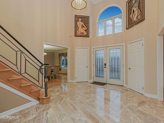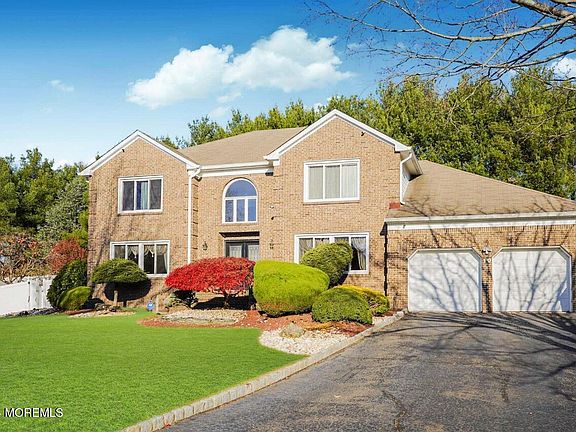 Nestled in the tranquility of a cul-de-sac, 10 Emmons Ct in Marlboro, NJ, offers a perfect blend of elegance and modern design. This stunning 5-bedroom, 2.5-bath center-hall colonial features a dramatic two-story foyer that sets the tone for the home's sophisticated charm. Beautiful tile and gleaming hardwood floors flow seamlessly throughout, complemented by exquisite decorative molding. The European-inspired modern kitchen, equipped with sleek stainless steel appliances, is a chef's dream. A custom iron and glass staircase with full oak stairs adds a striking architectural element. The fully finished basement elevates this home's entertainment potential, boasting a bar and a billiard room with custom-built seating perfect for hosting gathering. Step outside to your private oasis a heated, self-cleaning inground pool surrounded by a spacious paving stone terrace, ideal for outdoor relaxation or entertaining. This home truly combines luxury, comfort, and convenience in a highly desirable location.