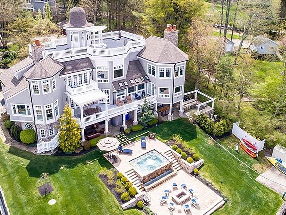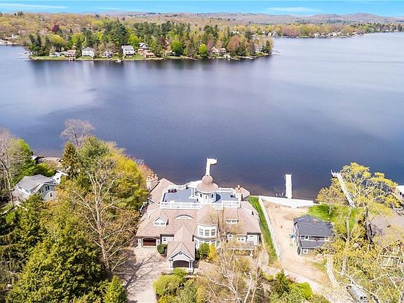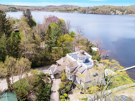 Stunning waterfront residence on Connecticut's largest natural lake, Bantam. This 8700 SF, 16 room stone and shingle home boasts views from every room as well as the rooftop bar, multiple balconies and terraces. This home is perfect for entertaining with a full kitchen outside with DCS appliances, pizza oven, dining on stone patio or upper level balcony, lounging area with TV, Gunite infinity hot tub/pool, terrace with fire pit, dock & beach area. The main living space has an open floor plan with endless lake views, chef's kitchen with top of the line appliances, butler's pantry, dining area with access to balcony, formal dining room with fireplace and sitting area with fireplace. There are two master suites, one on the main level and one upstairs. Both have fireplaces and sitting areas (one with a Japanese shower room). There are two additional en suite bedrooms and beautiful murals hand painted throughout. This one of a kind home has it all with a movie theater with high def projector, cigar and wine room, spacious rec room with pool table/games, bar & great room with retro kitchen, spa with steam shower & sauna and easy elevator access to every floor. More features include Sonos sound system, irrigation system, waterfall in entrance, generator, propane radiant heat, CAC, central vac, electric car powering station, two outbuildings/garages, laundry on each floor, dry cleaner, security system, and more! 90 miles from NYC. Available Jan 1, 2023-May 1, 2023. Shown by appt.