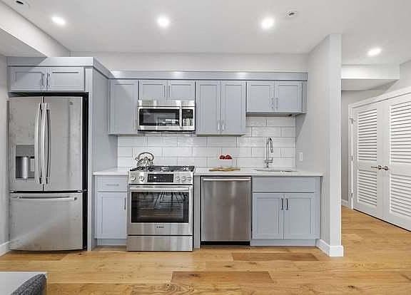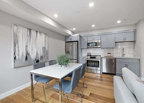 2021 brand new construction one bedroom condominium in Jeffries Point's latest boutique luxury building, The Everett. Large open concept living room/kitchen with quartz counter tops, stainless steel appliances including dishwasher and gas cooking, ample cabinet space and separate dining area. Sparkling new bathroom with large vanity, shower/tub with gleaming subway tile and full-sized stackable washer/dryer. Hardwood flooring throughout. 5 min walk to waterfront & Tall Ship. 5 min to State St and 15 min to MGH via Maverick Blue Line/Water Taxi. Elevator and gym in building. Available May 1.