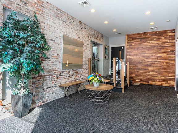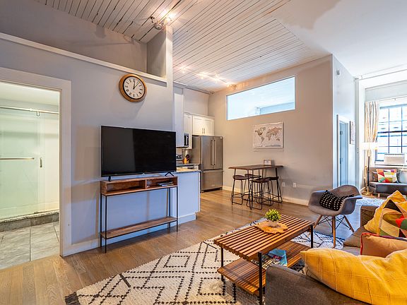 Inside, the home pairs historic character with modern comfort. Soaring ceilings, exposed brick, and oversized windows fill the space with light and charm. The open-concept living area flows into a sleek, updated kitchen with granite countertops, stainless steel appliances, and crisp cabinetry, while hardwood floors tie the layout together with warmth.