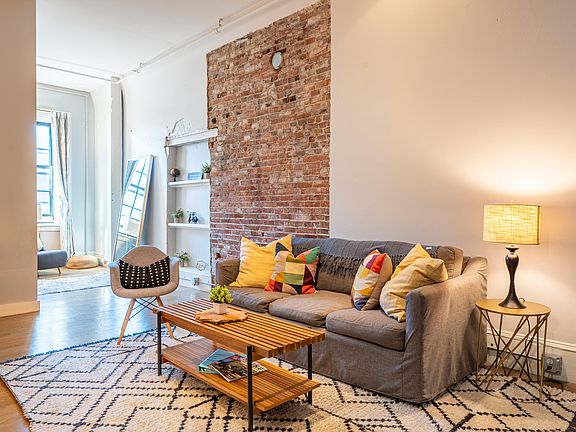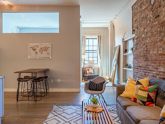 The bedroom retreat is highlighted by dramatic brickwork and tall windows, offering a private yet airy escape. A stylish bath with granite vanity and glass shower rounds out the home's thoughtful design.