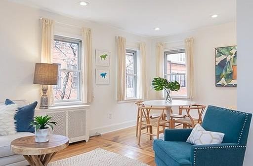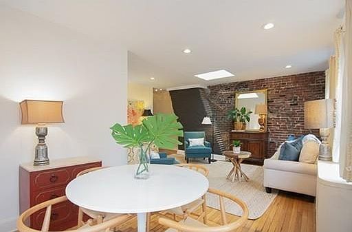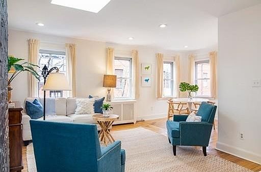 Corner penthouse unit on a gorgeous, tree-lined street in historic Bay Village. Three skylights and plentiful windows fill this spacious 1-bedroom unit with light year-round. The large living space allows a variety of uses â a single living room, an adjoining office, or a second bedroom/nursery. Exclusive roof rights provide views of the Boston skyline and the potential for a roof deck customized to your tastes. The home features charming exposed brick, in-unit laundry, and ample storage, with additional deeded basement storage. Both kitchen and bathroom have been tastefully renovated recently. Gardens and parks (including a fenced dog park) are within a block, while itâs just minutes to public transit (orange, green, red and bus lines), the Public Garden, Whole Foods, and any restaurant/shop you could imagine. Modest association fees cover maintenance (new roof in 2015), heat and hot water expenses. A one-of-a-kind home located in the special neighborhood & community of Bay Village.