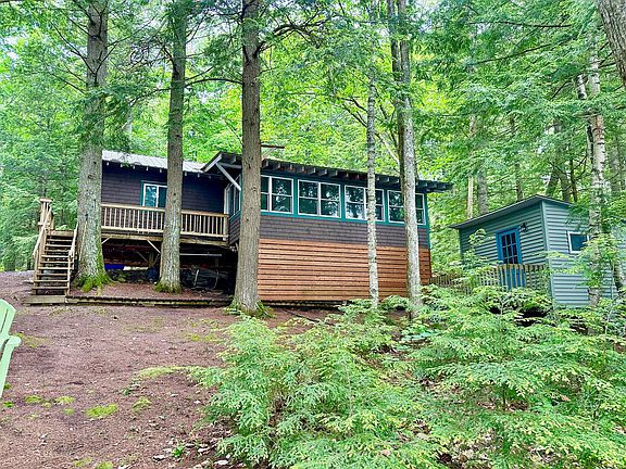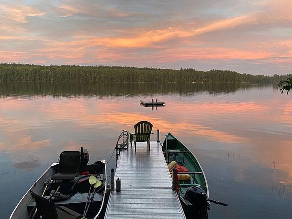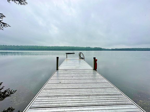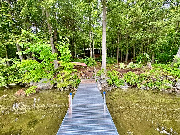 PARKER POND - Turn-key and well maintained, 2 bedroom + sleeping loft cottage with one-level living and 100' of private lakefront on highly desired, pristine Parker Pond. Many updates including a metal roof, new posts/pads, insulation underneath, new siding and insulation, pine walls, new windows and bathroom. Large family room with a wall of windows facing the lake, cozy living room with propane fireplace & vaulted ceilings, galley kitchen with dishwasher, washer & dryer, full bath with tub/shower unit, primary bedroom with closet, guest bedroom and space for guests in the sleeping loft! Cottage comes fully furnished including Smart TV and new L-shaped couch. Go fishing from your private dock or enjoy a nice boat ride in the aluminum fishing boat & with a 40hp motor. Experience the tranquility of the lake on one of the two kayaks or canoe. Sit on the dock or lounge on the float to take in the sights and sounds of this beautiful area. Swim in the clear water right off the dock with ladder. Storage shed for all the toys, private dock system, swim float, full septic system with leach field, year-round road access with internet available. Equipped with high-speed internet and computer desk overlooking the lake if you want to work from home. Walking distance to Parker Pond Headland Preserve trail system. Birch Island is a short distance kayak or swim away with lots of wild blueberries and public camp site as well as many other islands and shoreline to explore! Association boat ramp, so you can put your boat in, as there is not a public boat ramp on this lake, so very peaceful and tranquil quiet spot at the end of the road. Parker Pond has above average water quality, no invasive plants and excellent sport fishing! Properties like this on Parker Pond do not become available very often - come make this one yours and enjoy summer at the lake!