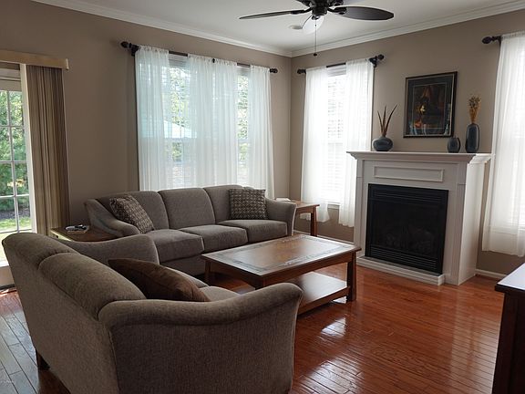 Lovely Hatteras model in the active 55+ community of Heritage Point. Wood floors throughout living room, family room, dining room, office and breakfast area. Granite countertop in kitchen with breakfast bar. Large walk in pantry. All appliances included. French doors to office/den. Master bedroom with his and her walk in closets. Master bathroom with separate tub and shower stall. Family room with fireplace, formal living and dining rooms. Pull down stairs in garage to floored attic for lots of storage. Nice tree lined backyard with large patio. Community features 2 clubhouses, indoor and outdoor pools, fitness center, tennis courts, putting green, shuffleboard and more.
