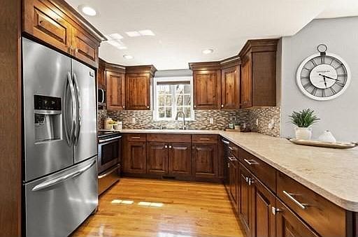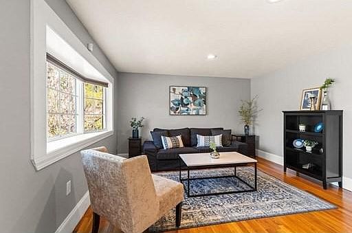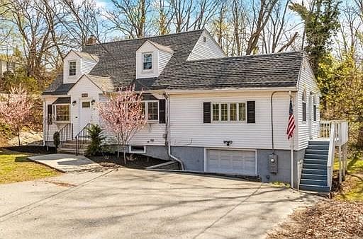 Beautifully renovated Cape style home located on a wooded lot near the Fells Reservation offers comfort, style and green space. The main level of this wonderful home offers a grand family room with windows on three sides, recessed lighting & direct access to the side and back yard areas. Chefs kitchen features granite countertops, stainless steel appliances, tiled back splash & and an oversized breakfast bar/peninsula. Convenient open floor plan for living, dining & family room creates a nice flow for everyday living. In addition, there is also a formal parlor area (or home office space), a spacious bedroom and a stylish bath with tiled shower & glass doors on the main level. The upper floor offers 3 bedrooms and a full tiled bath with tub, shower & glass doors. Live in comfort with central heating and central air conditioning controlled by nest thermostats. Enjoy miles of walking/hiking/mountain biking trails and green space in the Fells Reservation. Easy commuting access to 93.