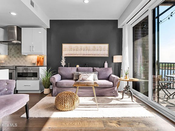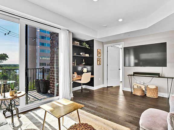 This CUSTOM designed FULLY FURNISHED condo, in amenity rich River Place, is located in the heart of historic Wilmington. NOTE: this condo has higher end finishes, a balcony and exclusive access to the Tower lobby with concierge services, club rooms featuring a pool table, meeting area, coffee/wet bar, and pet spa. Enjoy the open concept living area, eat in kitchen and private BALCONY perfect for al fresco dining all while taking in stunning river and sunset views. Quartz counter tops, stainless steel appliances, including an induction cooktop and convection oven with warming drawer, built in microwave, w/d, custom built in closet and Murphy bedroom also with a beautiful river view. Make sure to watch the 4th of July fireworks from the roof top terrace with pool, jacuzzi, grill, firepit and fitness center all overlooking the USS North Carolina. One assigned parking space directly outside entrance on same floor as unit. EV charging available in parking structure. Bijou park runs through the property leading to on site grocery store, Axis fitness, Mellow Mushroom and Ruth's Chris! Close to Thalian hall, Wilson center, CFCC, Live Oak Amphitheater, top restaurants, boat docks at Port City Marina and much more- you're in the heart of it all! HOA 1 $380.38/mo; HOA 2 $100/mo for parking.