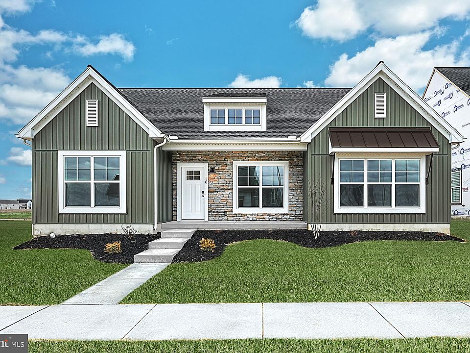 This charming 1-story home features a welcoming front porch, stylish exterior finishes, and a 2-car, rear-load garage with mudroom entry. The mudroom provides access to a spacious pantry and laundry room. To the front of the home is a study, second bedroom, and full bathroom. Beautiful vinyl plank flooring in the foyer extends throughout the main living areas, along with gracious 9’ceilings. The kitchen boasts stainless steel appliances, quartz countertops with tile backsplash, and a large center island. It also shares a cathedral ceiling with the family room, warmed by a gas fireplace with full height stone surround and box beam mantel. Sliding glass door access from the dining area leads to a screened in porch. The owner’s suite, off to the side of the home, includes a private bathroom with tile shower, double bowl vanity, and an expansive closet.