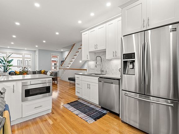 Avail 12/1 or 1/1. This beautiful 2020 townhouse, unfolds across 1641 sq feet of meticulously crafted space. Designed with a blend of style and functionality, the open-concept kitchen features ample cabinetry, high-end stainless steel appliances, & quartz countertops with a peninsula perfect for entertaining. The flexible dining and living areas are bathed in natural light, thanks to oversized windows and high ceilings, creating an inviting atmosphere. On the upper level you'll find the primary bedroom, a serene retreat that accommodates a king-sized bed, complemented by a luxurious bathroom and a wall of closets. The spacious second bedroom also offers its own en-suite bath and generous closet space. On the lower level, discover a versatile space perfect for a home office and gym, or use it as a third bedroom with access to a walkout patio. This home is complete with a private roof deck with sweeping views of the Boston skyline, a one car garage, central AC and hardwood throughout.