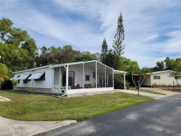 OWN THE LAND! Great location, close to Marco and downtown Naples plus easy access to I-75. This home sits on an outside corner giving it more open space and privacy on the east side. The front entrance has a large screened lanai with sliders that lead into a spacious living area with an open floor plan. Vaulted ceilings in the living room, dining, and kitchen area make the space seem huge! This cozy 2 bedroom, 2 bath has a den or use another bedroom or a she shed on the ground level. Master bedroom is spacious with walk in shower, double sinks, and a tub. The carport and front screened area was rebuilt in 2020. Large community pool, clubhouse and mailroom with picnic area. Storage space for your boat or trailer. Association fee includes lawncare and water. Pets welcome!
