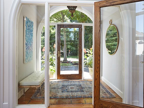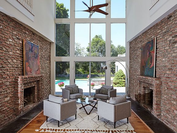 Walk to town and two miles to train from this shockingly close to everything sprawling estate enveloped by nature. Found at the end of a private cul de sac just one mile from town this 2.2 acre property adjoins nearly 7 acres of a nature preserve. There is nothing to do but enjoy the serenity of the surround and quiet of home intertwined with careful execution of architectural delights. Double story floor to ceiling windows greet your guests as the eye is drawn from interior splendor to outdoor pastoral pleasures. Wide plank oak flooring, brick and weeping mortar double fireplace walls, sweeping staircase are but a few of the dazzling and uncommonly found features. Dramatic open spaces, with each room situated to maximize the private views allow you to entertain large scale or create cozy places with sensible spaces with the flexible floor plan. Formal living and dining rooms flank the main two story grand entry room, modern and chic kitchen opens to breakfast area with soaring ceilings and family room complete the first floor. Ascend thirteen foot wide oak steps to the second level boasting Jack and Jill bedrooms plus an en suite bedroom. Party room and bedroom with full bath are set above the garage and a legal apartment is nicely positioned in the expanisive finished lower level. A home for everyone, close to everything and like nothing else. Experience the significance of 10 Guard Hill.