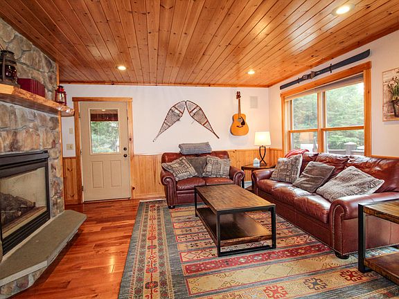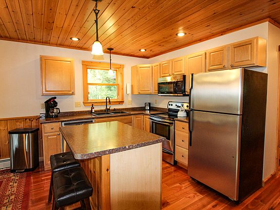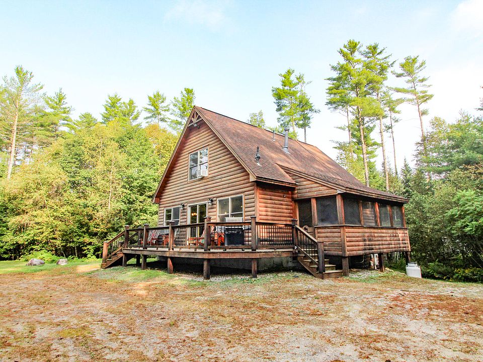 This beautifully designed and fully furnished 3-bedroom, log-sided chalet is located just 5 minutes from downtown Bethel and boasts an historic rental history. The property features a wrap-around driveway, generous yard space, paver walkway, and an 8x16 shed, ideal for storing outdoor equipment. Two mudrooms provide convenient access from the side main level and lower levels of the home. The main level offers a full bathroom with glass doors, a spacious bedroom, and an open-concept kitchen, dining, and living area with pine siding and a gas firepace. Off the living room, you'll find a screened-in porch with a picnic table, while the grill is conveniently located on the wrap-around deck. Throughout the home, hardwood, carpet, and tile flooring are in excellent condition. The upper level features two large bedrooms with a shared bathroom, and the lower level includes a family room, the second mudroom, owner lockout closets, laundry facilities, and a utility room. This property is a perfect blend of comfort and functionality, ready to meet your every need.