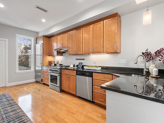 An impeccable urban retreat in the heart of Charlestown. This serene residence offers a blend of elegance and modern comfort, featuring 2 beds / 2 full baths and a very large 576 sq. ft. private deeded roof deck. Step inside and be greeted by an open and airy floor plan, adorned with high ceilings, skylight and large windows that bathe the interior in natural light. The living area is gracefully appointed, providing an inviting space. The kitchen features wood cabinetry, stainless steel appliances, drinks refrigerator & ample counter space. The large primary bedroom is a tranquil sanctuary, offering a peaceful escape. The luxurious ensuite primary bathroom exudes sophistication with its modern fixtures & a spa-like ambiance. Second bedroom makes for a cozy space next to the beautifully renovated guest bath. The living area offers direct access to the spectacular and very large private roof deck. Convenient in-unit laundry. Additional storage space in the basement of building.