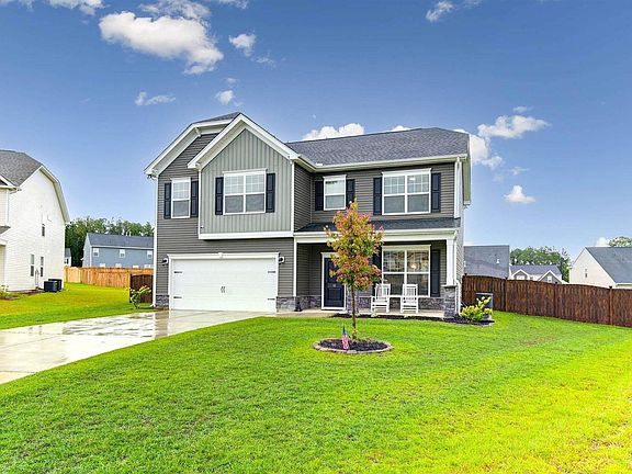 Welcome to your next home at 10 Hay Field Court in Lugoff, SC. Situated on a large .37 acre lot this beauty is only 3 years old and move in ready. Downstairs features a formal dining room and spacious kitchen that opens to the living room, perfect for entertaining. Upstairs you will find 4 bedrooms, with the primary bedroom boasting a large bathroom and walk-in closet and many custom decorative features. The primary suite along with one of the secondary bedrooms and common areas have been upgraded with a lovely vinyl plank flooring. The backyard greets you with a double sized patio and large level lot, fully fenced and ready for whatever your needs may be. Located on a quiet cul-de-sac and just down the street from a community park, yet minutes from interstates, what more could you ask for?